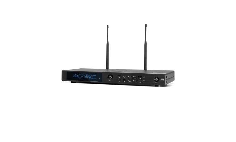Đầu thu của micro được thiết kế với màn hình LCD sắc nét, giúp hiển thị rõ ràng tần số và các thông số quan trọng. Mặt trước được hoàn thiện bằng phay nhôm đen, tạo nên sự hiện đại và thanh lịch, dễ dàng hòa hợp trong mọi không gian sử dụng, từ gia đình đến sân khấu chuyên nghiệp.