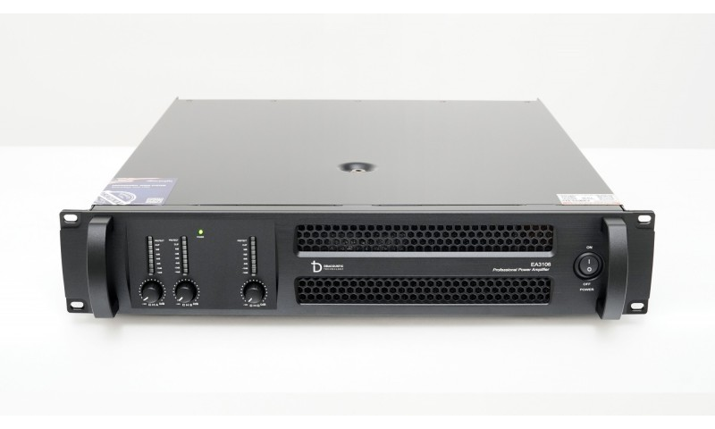 EA3106 được thiết kế với chuẩn kích thước 482x505x90mm, kiểu dáng mạnh mẽ, sắc sảo nhưng vẫn giữ nét tinh tế. Khung máy chắc chắn, sơn đen tĩnh điện sang trọng dễ phối hợp với mọi không gian lắp đặt. Mặt trước bố trí các núm volume điều chỉnh riêng biệt cho từng kênh, công tắc nguồn và hệ thống đèn LED hiển thị trạng thái hoạt động, giúp người dùng dễ dàng quan sát và thao tác.